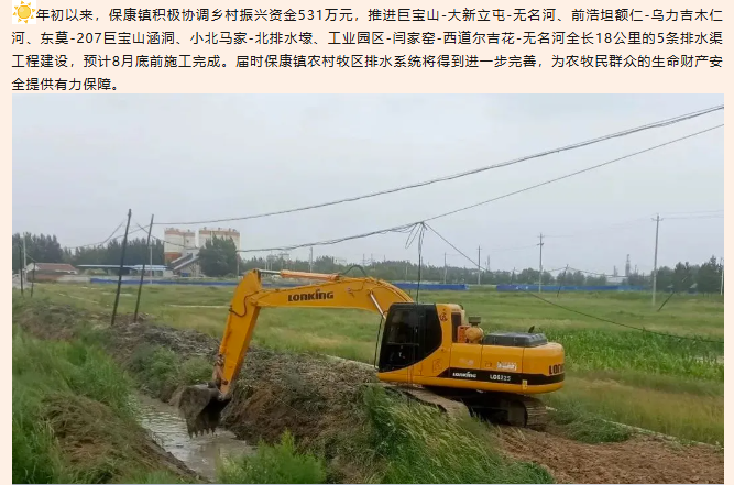 年初以来,保康镇积极协调乡村振兴资金531万元,推进巨宝山-大新立屯-无名河、前浩坦额仁-乌力吉木仁河、东莫-207巨宝山涵洞、小北马家-北排水壕、工业园区-闫家窑-西道尔吉花-无名河全长18公里的5条排水渠工程建设
