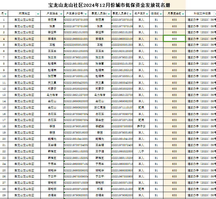 宝龙山龙山社区2024年12月份城市低保资金发放花名册