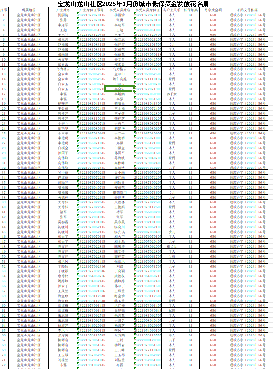 宝龙山龙山社区2025年1月份城市低保资金发放花名册