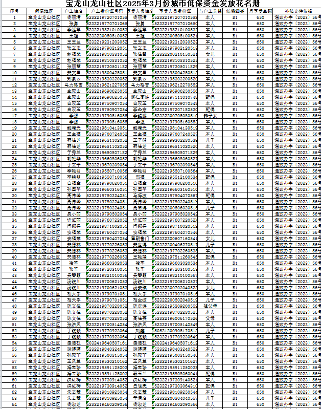 宝龙山龙山社区2025年3月份城市低保资金发放花名册