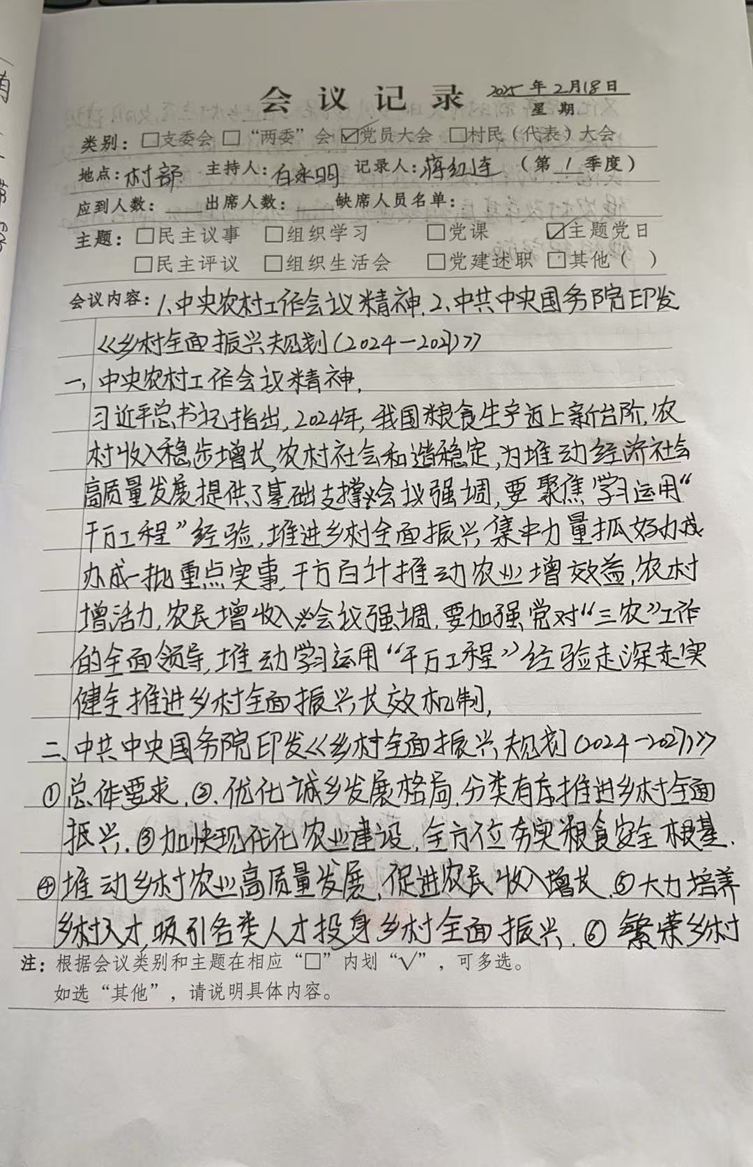 2025年2月18日主题当日活动,参会人员7人,党支部书记白永明组织党员学习(1中央农村工作会议精神 , 2中共中央国务院印发乡村全面振兴规划2024——2027)