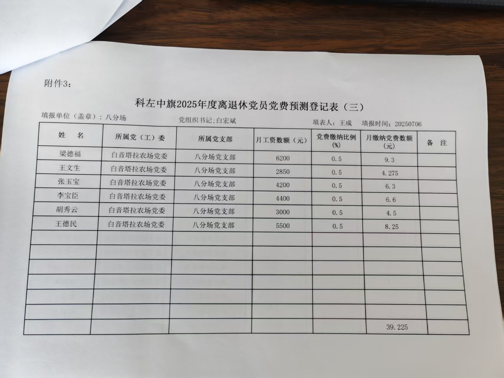 科左中旗2025年度党费预测登记表