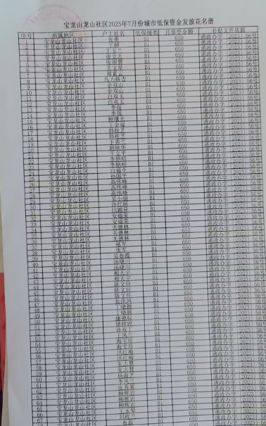 宝龙山龙山社区2025年7月份城市低保资金发放花名册