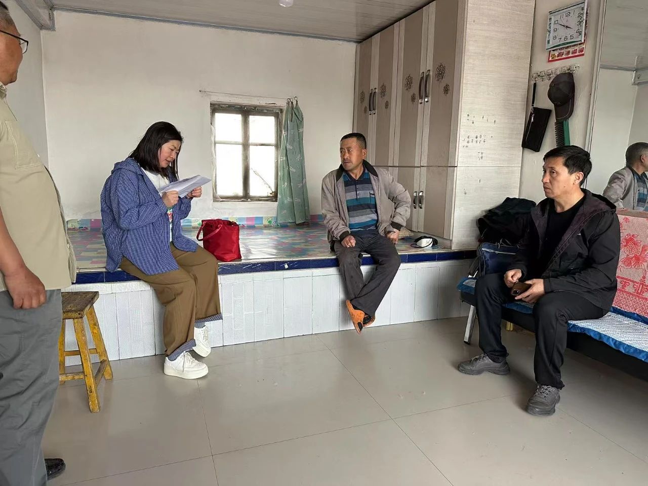 5月20日,民政局副局长白塔娜、主任曹玉森一行深入架玛吐镇十家户村开展入户核查低保申请户,随后到包联嘎查村北架玛吐嘎查了解派驻驻村工作队工作开展情况和生活情况。武装部长、政府副镇长包海顺陪同。