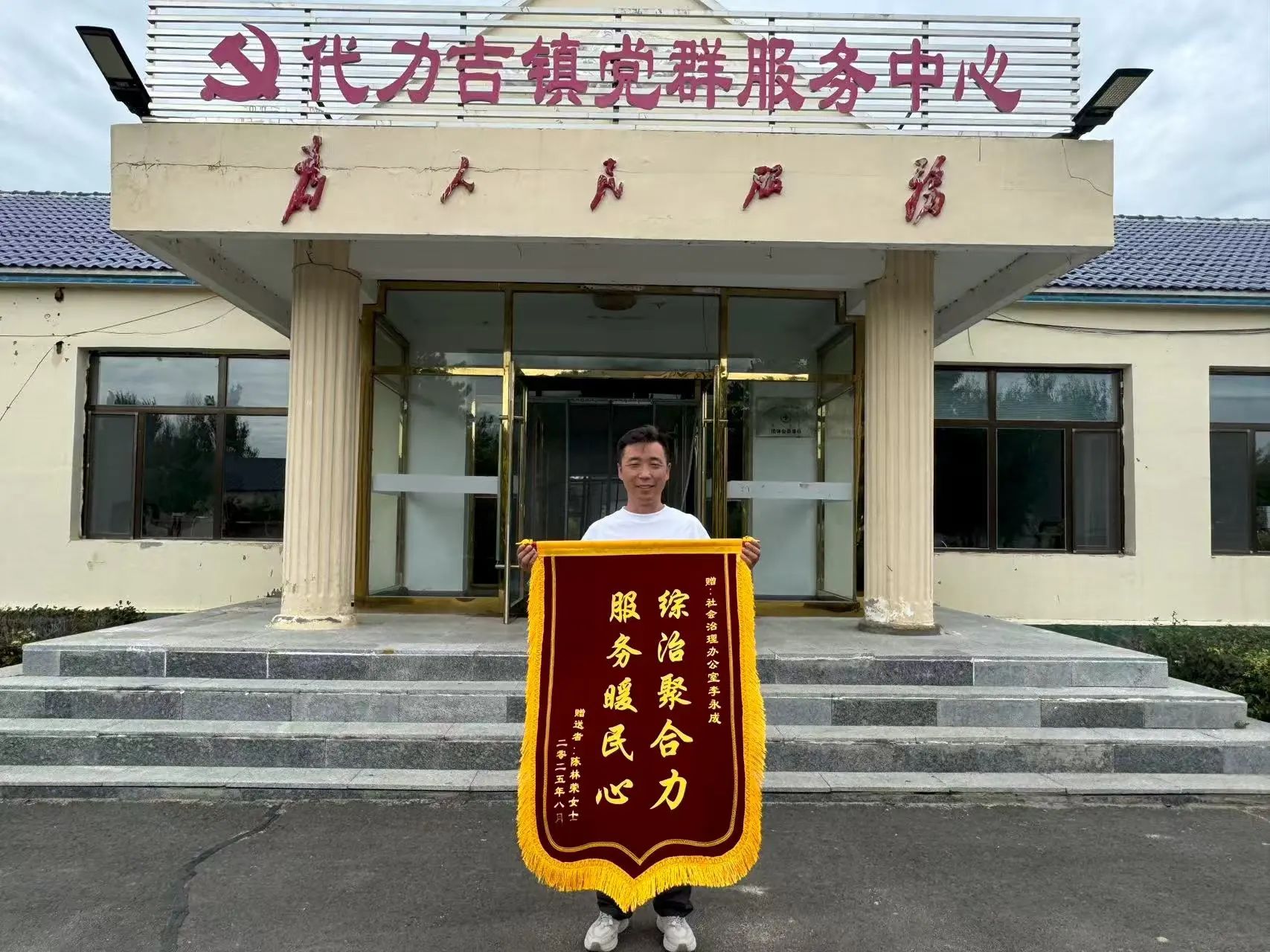 8月21日,代力吉镇查干敖日布皋嘎查村民将一面印有“综治聚合力 服务暖民心”的锦旗送到代力吉镇社会治理办公室工作人员李永成手中,对李永成的耐心答疑解惑工作表示感谢。李永成表示这面旗是认可更是责任,接下来将继续致力于为民解决“‘烦心事”,当好群众"贴心人"。