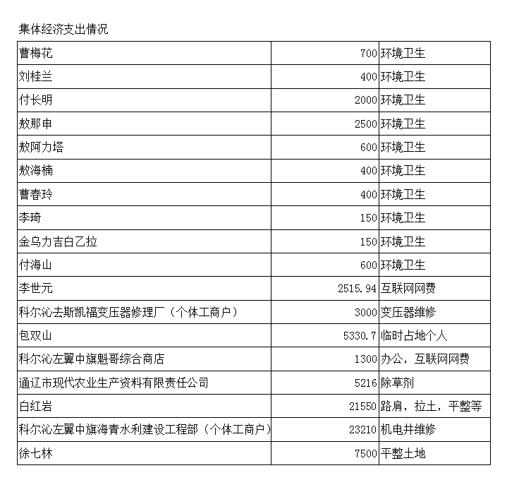 各项支出:集体经营支出;村组干部报酬;报刊费支出;办公费、差旅费、会议费、卫生费、治安费等管理费支出;集体公益福利支出;固定资产购建支出;征占土地补偿支出救济扶贫专项支出社会捐赠支出其他支出