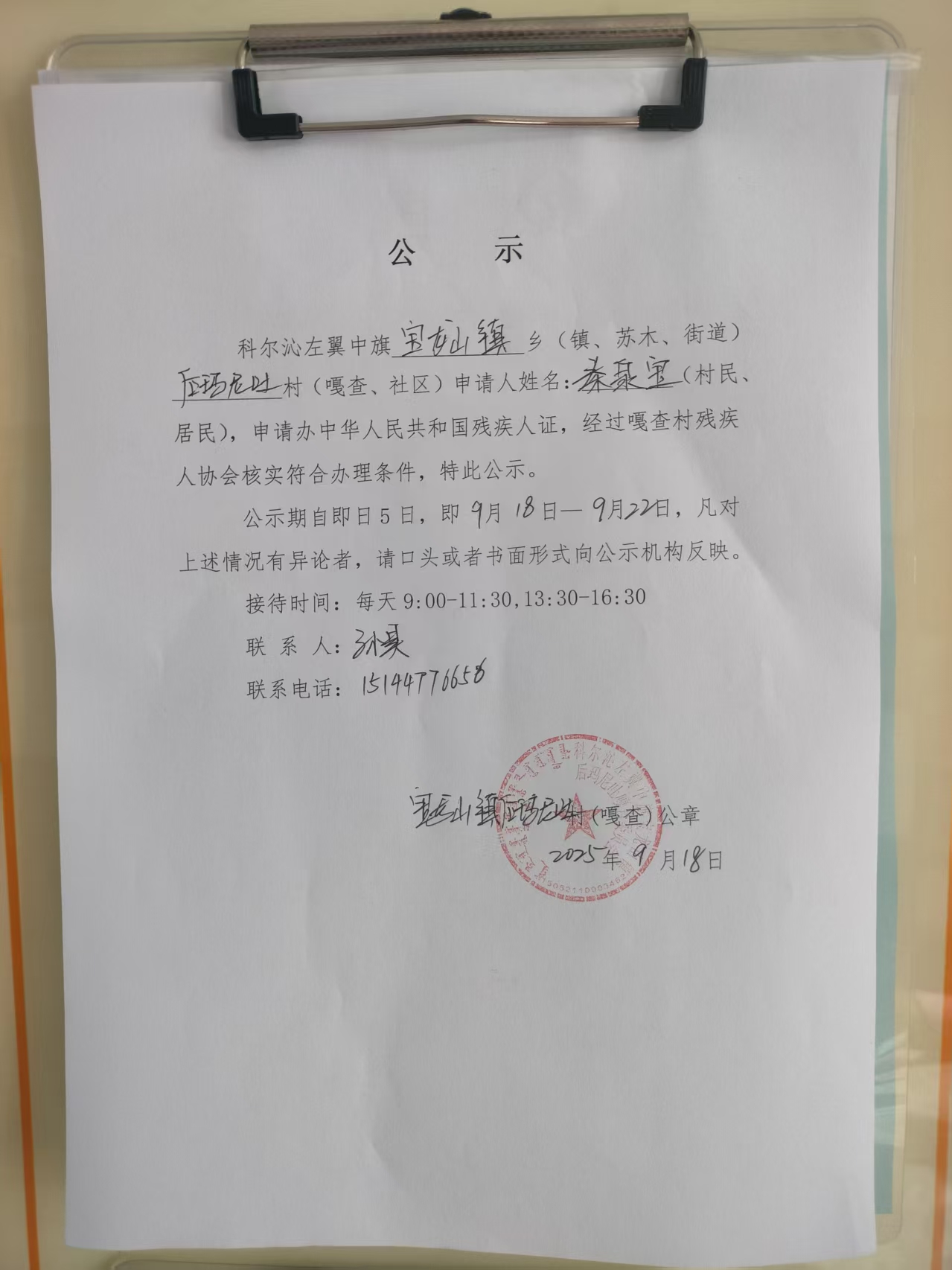 后玛尼吐嘎查秦全宝申请办理残疾证公示