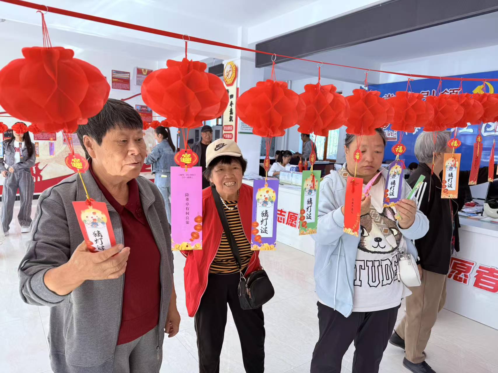 活动分为“灯谜竞猜”和“套秋菜”两大环节。灯谜区悬挂多条谜题,涵盖中秋典故、农业知识及成语典故,居民们或独自沉思,或三五成群讨论,现场充满智慧碰撞的火花。猜中谜题的居民可兑换套圈,参与“套秋菜”挑战。秋菜区摆放土豆、白菜、地瓜等丰收作物,居民们手持套圈精准投掷,欢笑声此起彼伏。活动还设置“丰收知识问答”,通过讲解节气农谚,加深居民对传统农耕文化的认知。