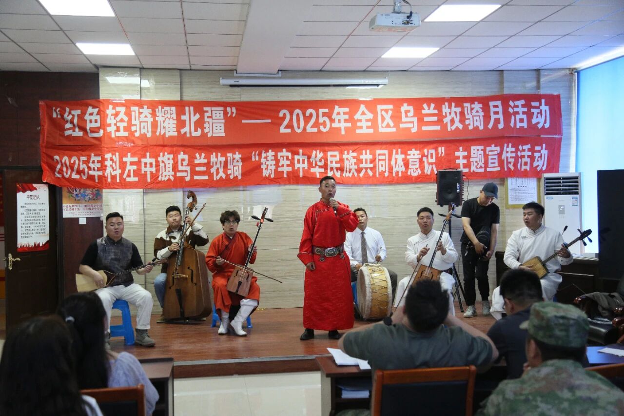 6月24日,科左中旗乌兰牧骑走进科尔沁社区,开展“红色轻骑耀北疆”——2025年全区乌兰牧骑月活动。深入贯彻落实习近平文化思想和习近平总书记给乌兰牧骑队员们的回信精神,以铸牢中华民族共同体意识为工作主线,推进北疆文化建设提升行动,落实自治区党委宣传部、自治区文化和旅游厅关于乌兰牧骑“学·创·演”工作部署。