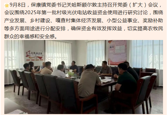 9月8日,保康镇党委书记关哈斯额尔敦主持召开党委(扩大)会议,会议围绕2025年第一批村级光伏电站收益资金使用进行研究讨论,围绕产业发展、乡村建设、嘎查村集体经济发展、小型公益事业、奖励补助等多方面用途进行分配安排,确保资金有效发挥效益,切实提高农牧民群众的幸福感和安全感。