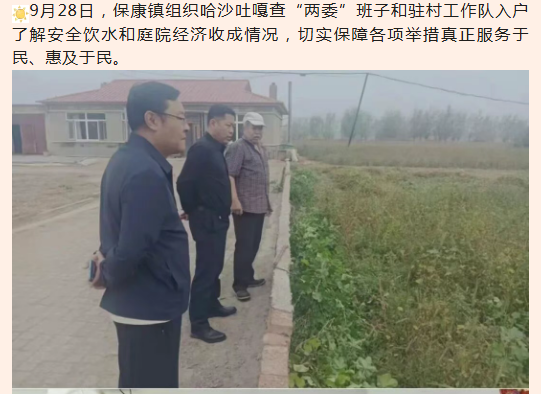 9月28日,保康镇组织哈沙吐嘎查“两委”班子和驻村工作队入户了解安全饮水和庭院经济收成情况,切实保障各项举措真正服务于民、惠及于民。