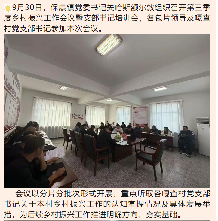 9月30日,保康镇党委书记关哈斯额尔敦组织召开第三季度乡村振兴工作会议暨支部书记培训会,各包片领导及嘎查村党支部书记参加本次会议。