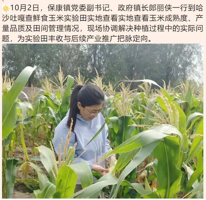 10月2日,保康镇党委副书记、政府镇长郎丽侠一行到哈沙吐嘎查鲜食玉米实验田实地查看实地查看玉米成熟度、产量品质及田间管理情况,现场协调解决种植过程中的实际问题,为实验田丰收与后续产业推广把脉定向。
