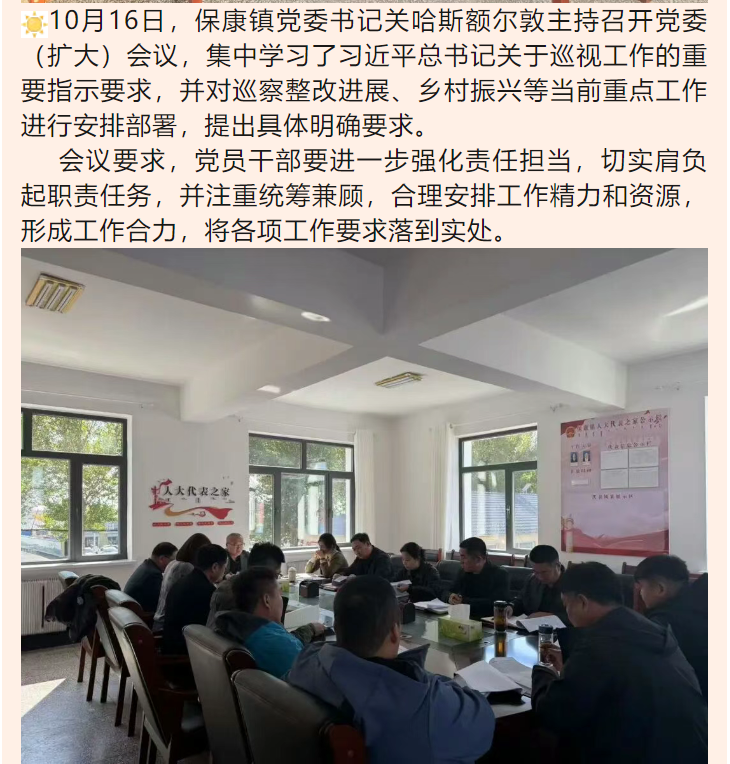 10月16日,保康镇党委书记关哈斯额尔敦主持召开党委(扩大)会议,集中学习了习近平总书记关于巡视工作的重要指示要求,并对巡察整改进展、乡村振兴等当前重点工作进行安排部署,提出具体明确要求。