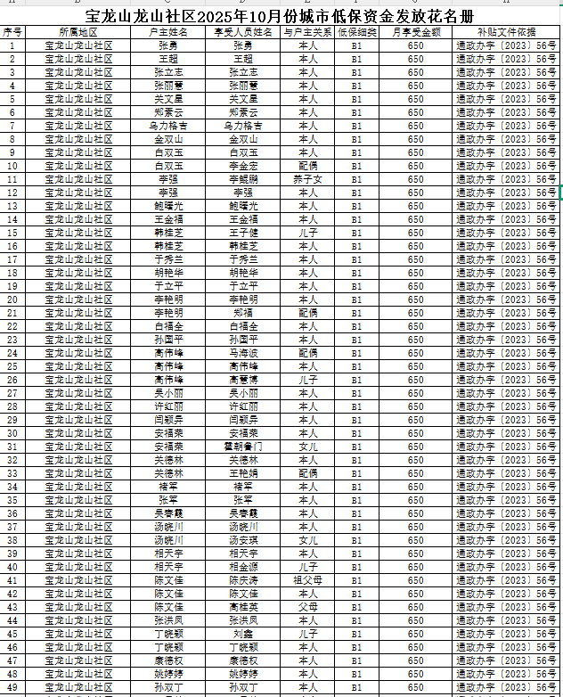 宝龙山龙山社区2025年10月份城市低保资金发放花名册