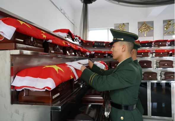 在主持人的引导下,礼兵小心翼翼地整理烈士骨灰并覆盖国旗。