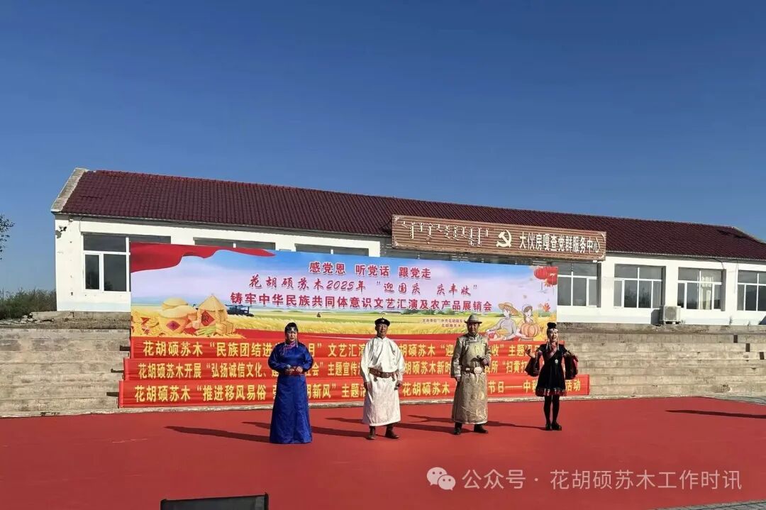 金秋送爽,硕果飘香,在中华人民共和国成立76周年之际,为进一步营造国庆节日氛围、展现丰收喜悦、深化民族团结,9月29日,花胡硕苏木党委政府精心组织开展“迎国庆 庆丰收”铸牢中华民族共同体意识文艺汇演暨农产品展销会在大伙房嘎查文化隆重举行。活动设置表演区、农特产品展示区、惠农政策讲解区3个区域,全面展现新时代花胡硕苏木发展生动图景,抒发广大干部群众对祖国的深情祝福和共享丰收的喜悦豪情。