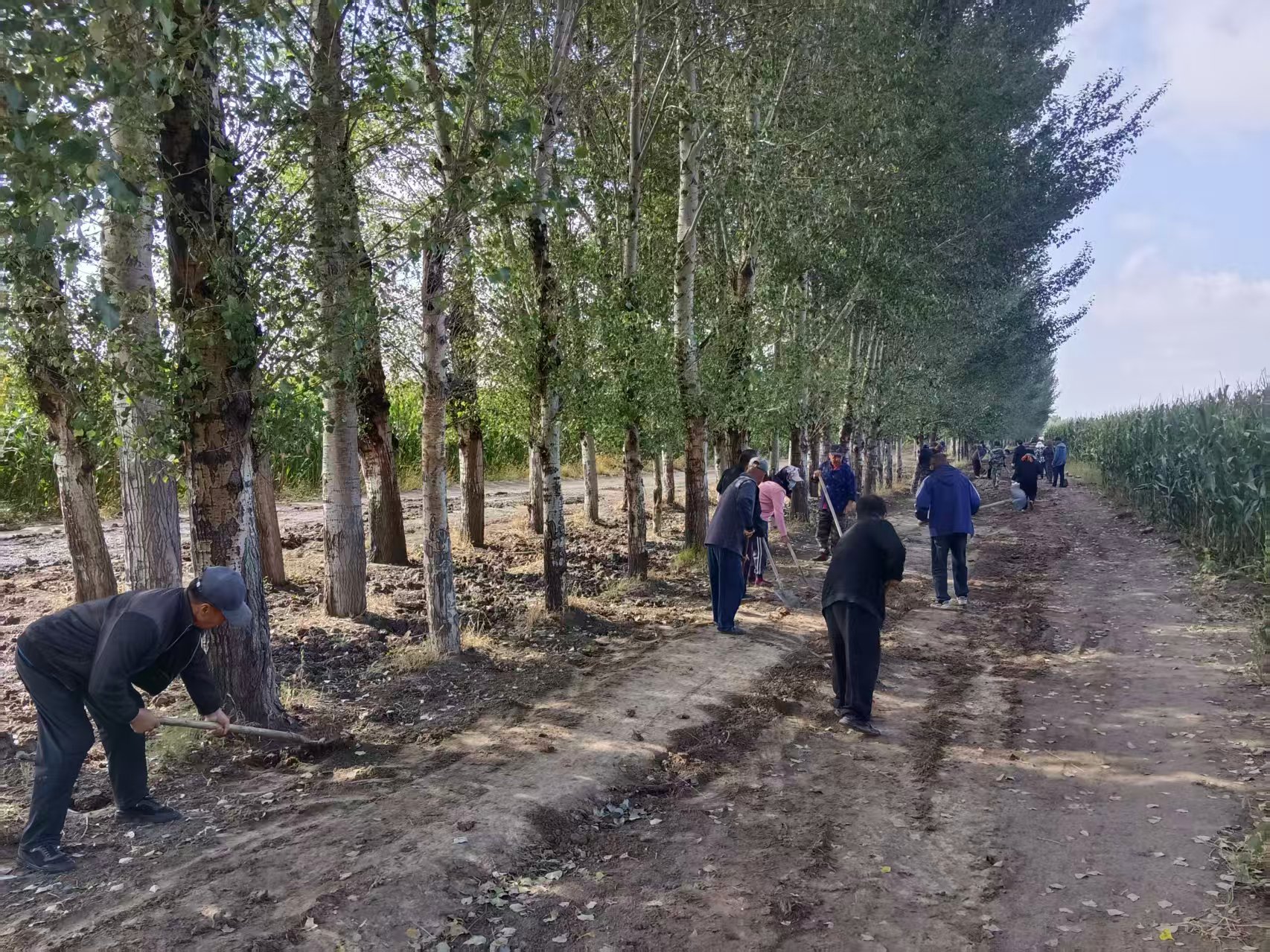 结合主题党日党员带领群众修复田间道路工作。