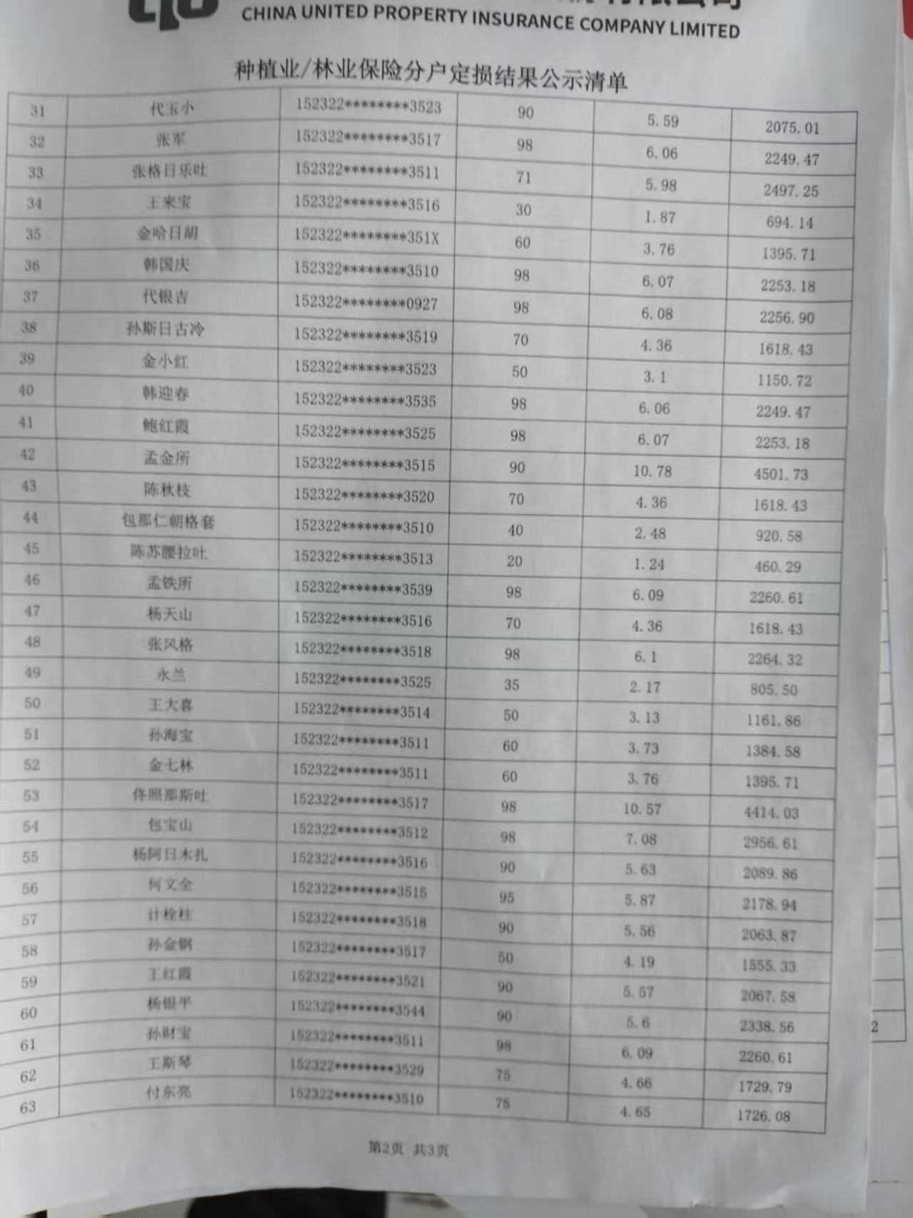 2025年玉米保险明细表