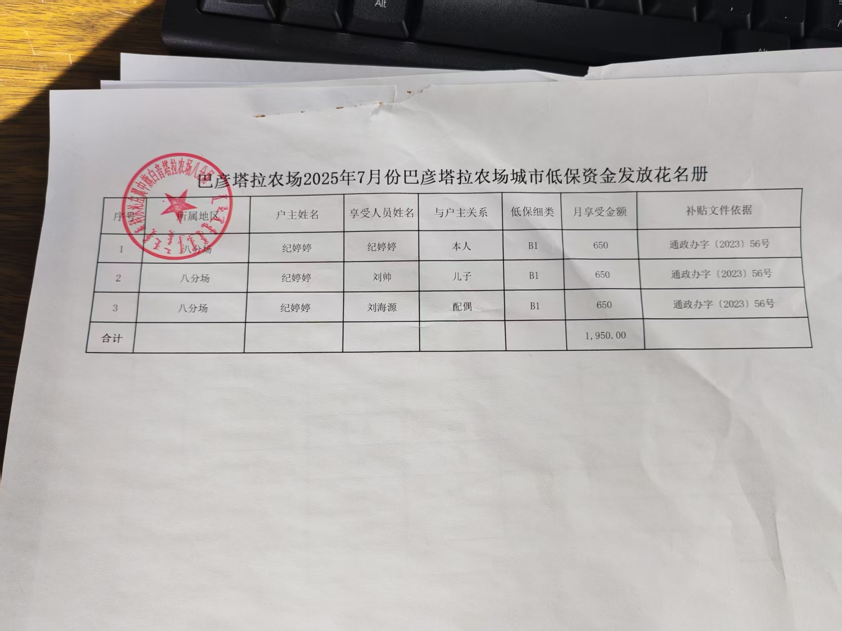 白音塔拉农场2025年7月份低保资金发放花名册