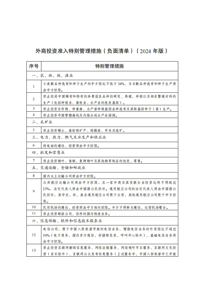 国家发展改革委 商务部令2024年第23号 外商投资准入特别管理措施(负面清单)(2024年版)