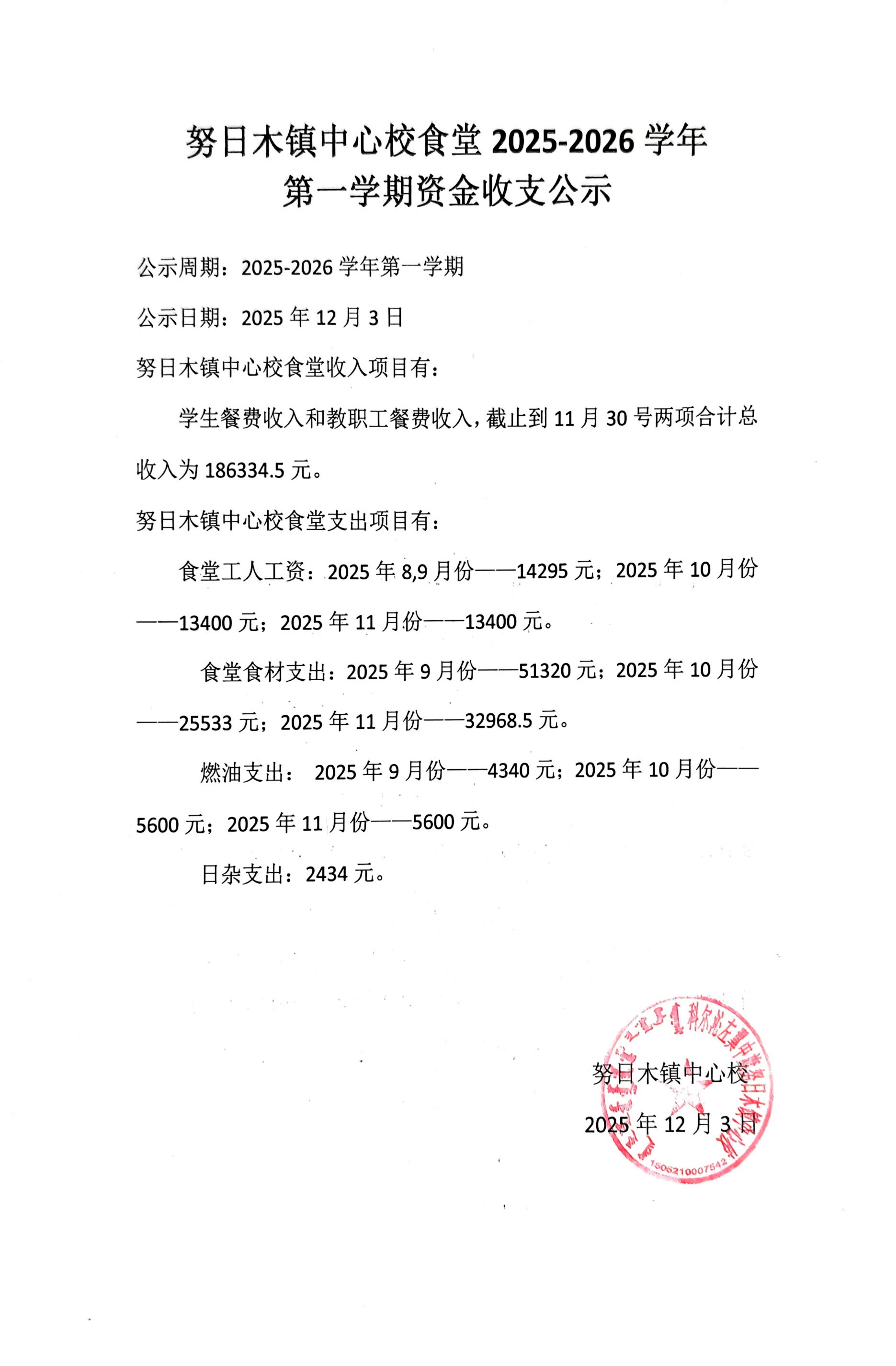 努日木镇中心校食堂2025-2026学年第一学期资金收支公示