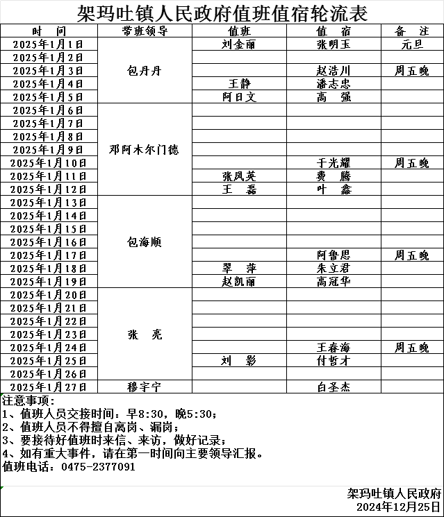 2025年1月架玛吐镇人民政府值班值宿轮流表