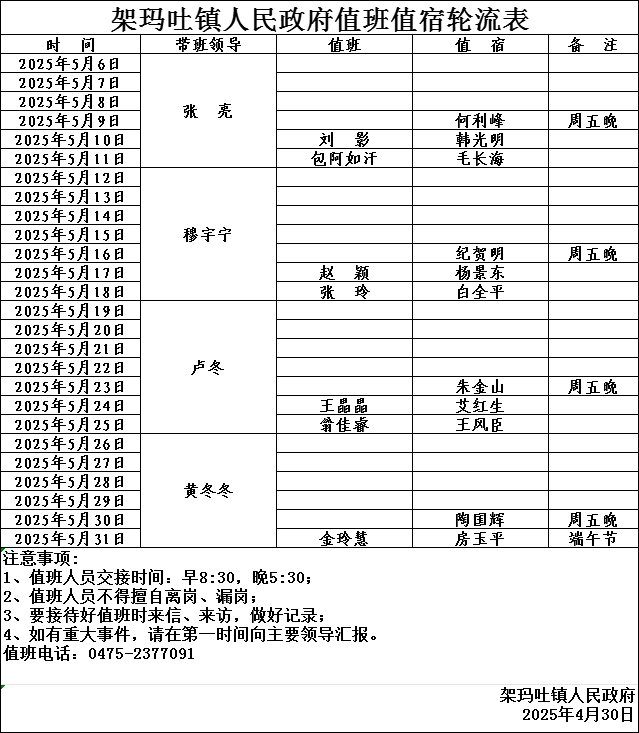 2025年5月架玛吐镇人民政府值班值宿轮流表