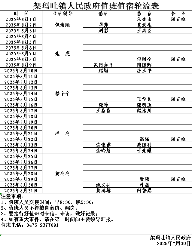 2025年8月架玛吐镇人民政府值班值宿轮流表