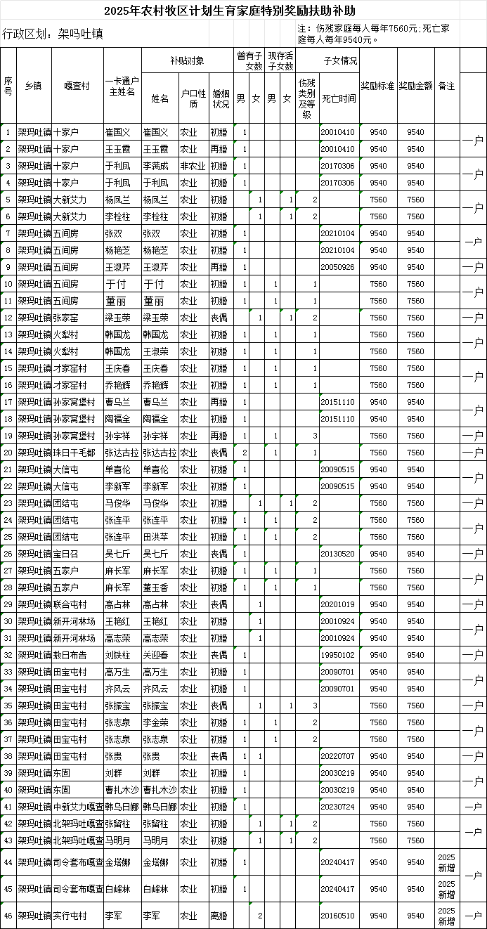 架玛吐镇2025年农村牧区计划生育家庭特别奖励扶助补助花名册