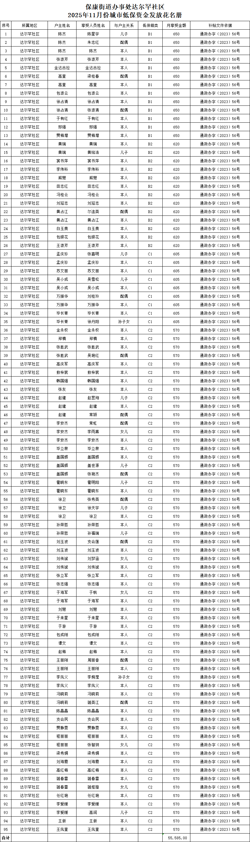 保康街道办事处达尔罕社区 2025年11月份城市低保资金发放花名册