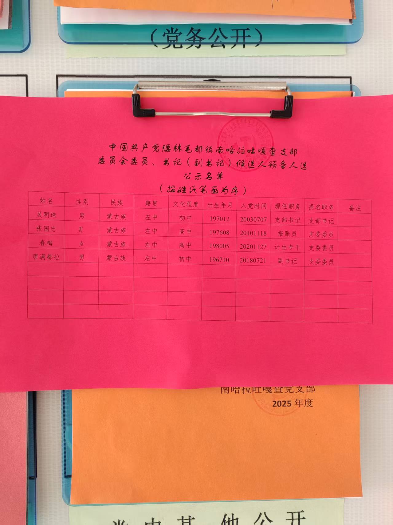 按照《中国共产党章程》等党内法规和上级党组织有关要求,我们于2025年12月28日在南哈拉吐村部召开党员大会进行换届选举,应到会党员15名,实到会党员13名,实到会人数不少于应到会党员人数的 4/5,会议有效。大会以无记名投票、差额选举的办法,选举嘎查党支部委员3名,他们是吴明珠(13票)、春梅(13票)、张国忠(13票);新当选的党支部委员召开会议以等额选举的办法,选举吴明珠(3票)为嘎查党支部书记.