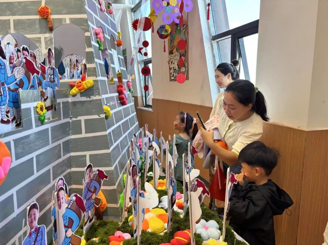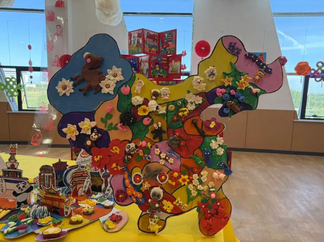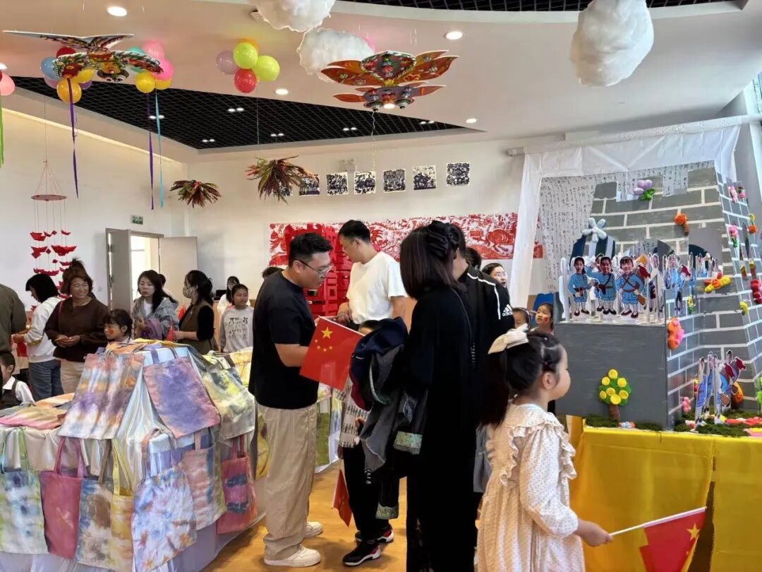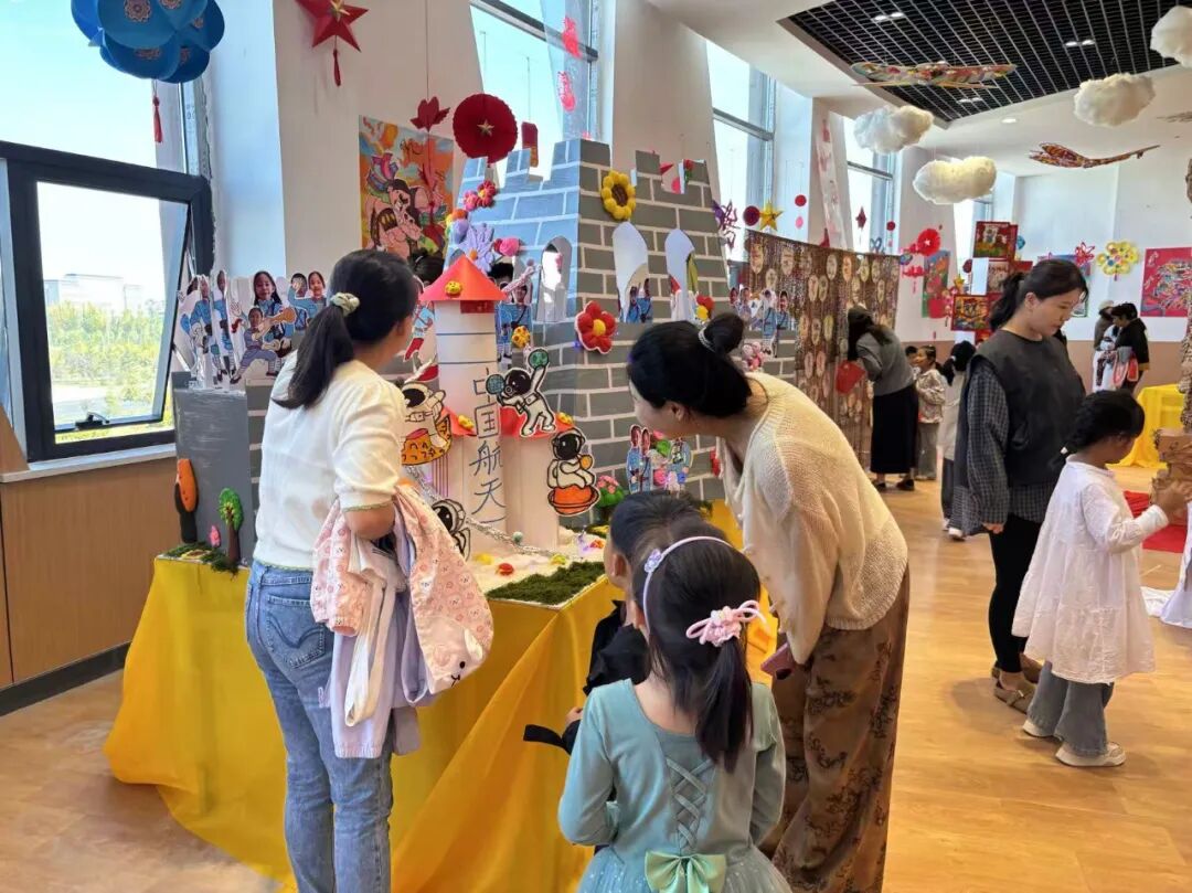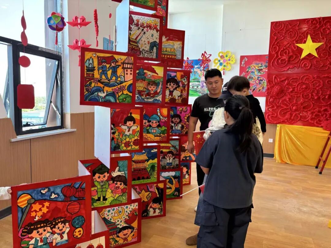 现场展品以爱国主题为核心,形式丰富多样且创意十足。有还原天安门、华表等标志性建筑的手工装置,有融入国旗元素的立体艺术墙,同时结合民族文化元素,全方位展现出童真视角下的家国情怀与艺术创意。