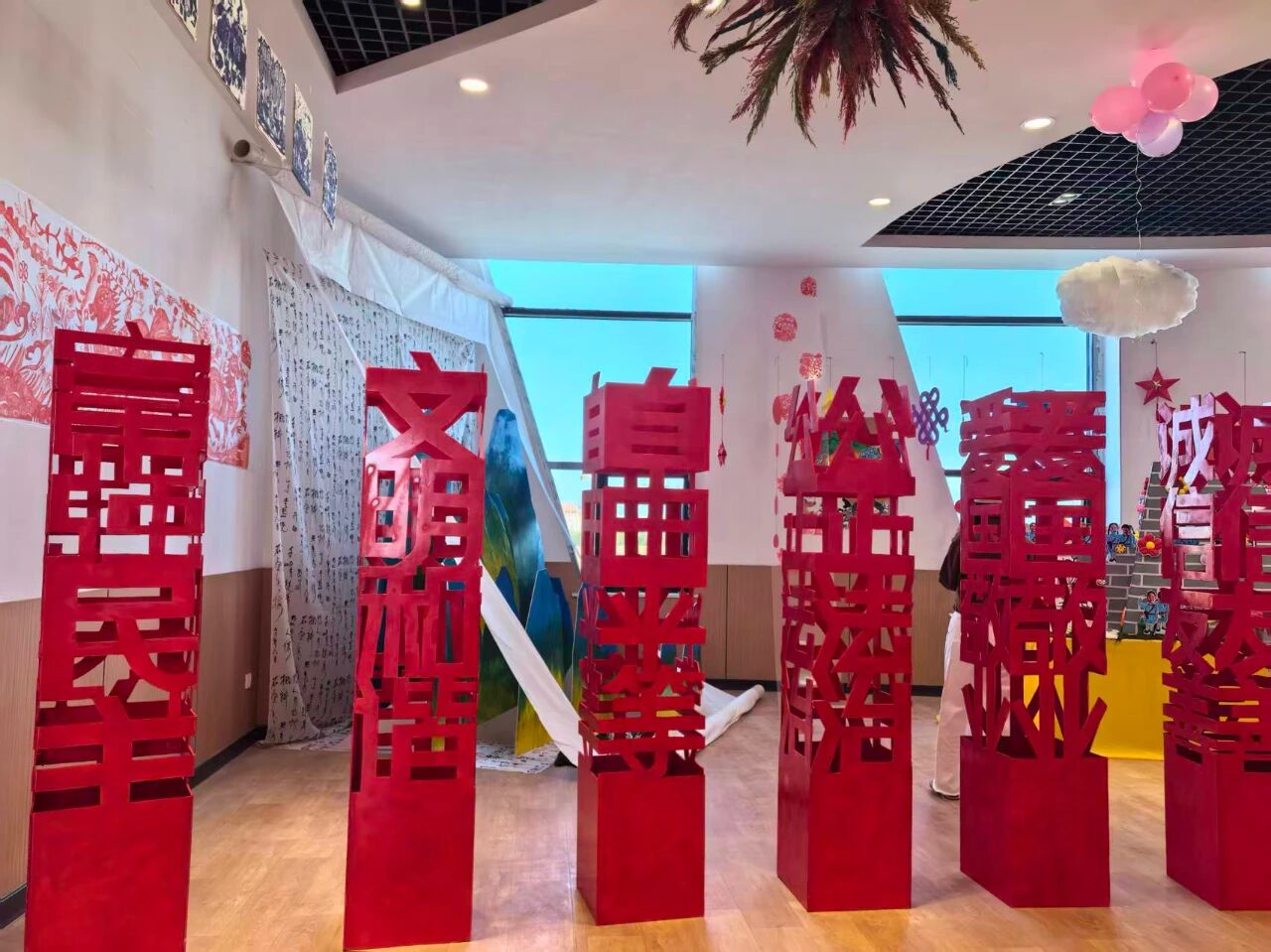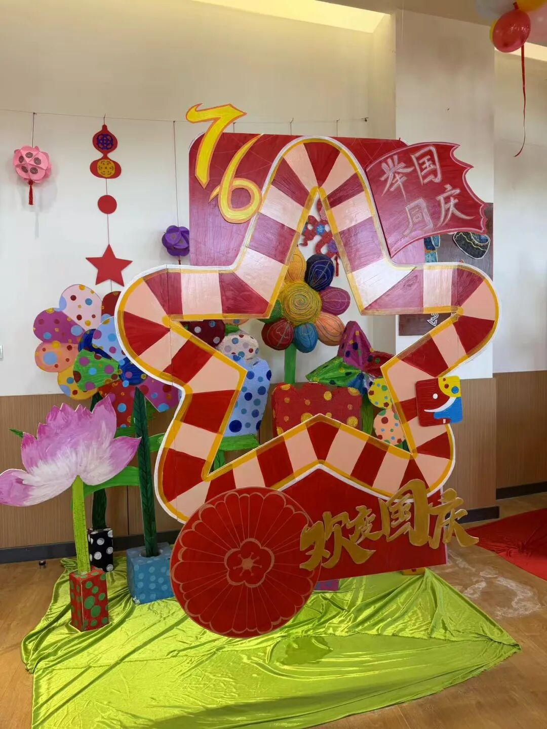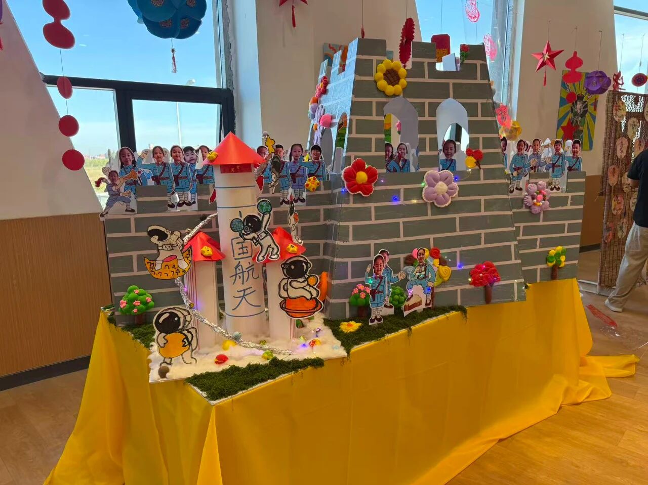 现场展品以爱国主题为核心,形式丰富多样且创意十足。有还原天安门、华表等标志性建筑的手工装置,有融入国旗元素的立体艺术墙,同时结合民族文化元素,全方位展现出童真视角下的家国情怀与艺术创意。