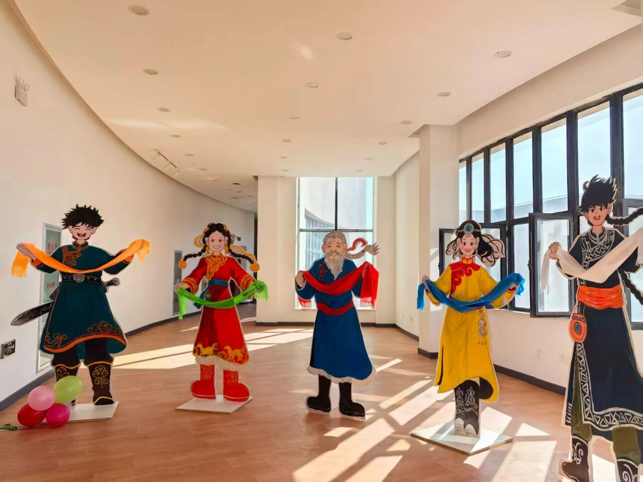 步入展厅,一幅幅充满想象力的作品瞬间抓住眼球,有身着蒙古族传统服饰的卡通人物立牌,色彩明艳、神态鲜活,尽显民族文化魅力。