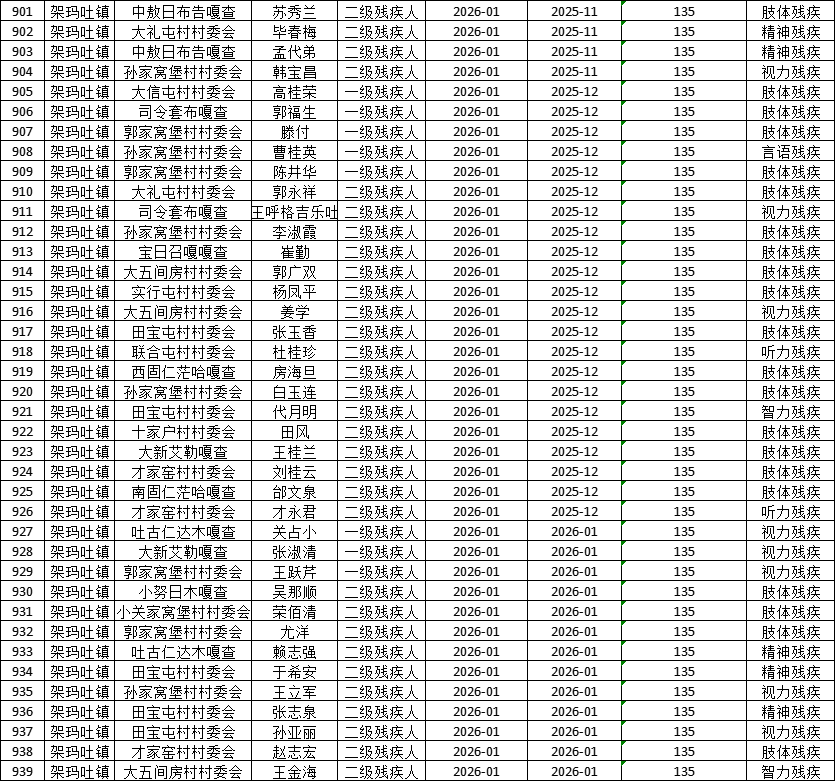 架玛吐镇2026年1月残疾人护理补贴发放花名册