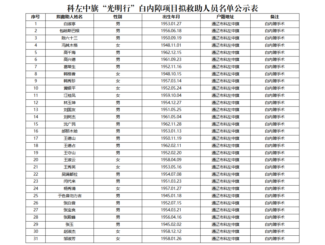 根据通辽市红十字会《关于开展2025年全区“光明行”社会公益活动的通知》要求,经筛查,拟确定以下人员为“光明行”项目救助对象,现向社会公示,公示期:2025年5月29日——6月5日,共5个工作日。