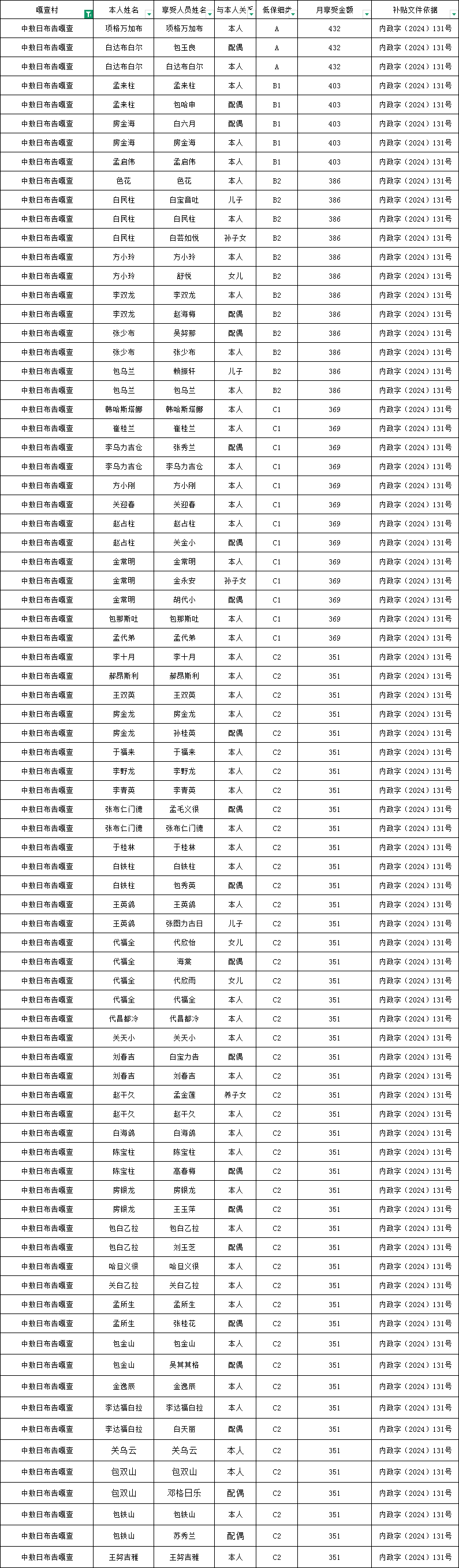 敖日布告嘎查2026年1月农村低保资金发放花名册