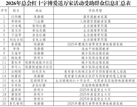 根据通辽市红十字会《关于做好2026年“红十字会博爱送万家”活动慰问物资接收发放工作的通知》要求,将中国红十字会总会下发的“博爱温暖包”受益群众名单公示如下。