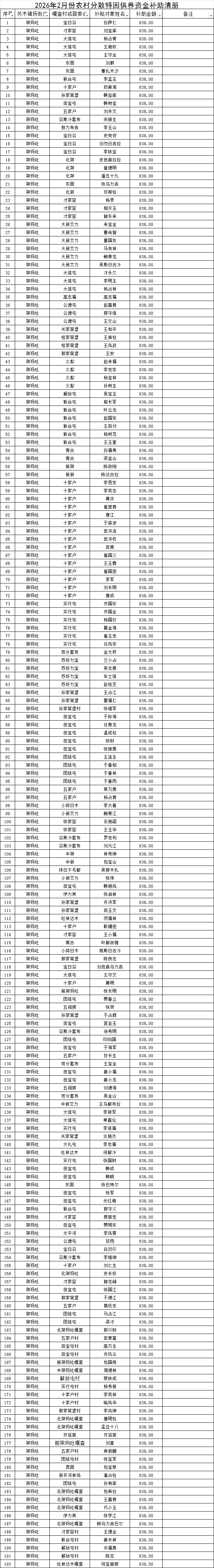 架玛吐镇2026年2月份农村分散特困供养资金补助清册