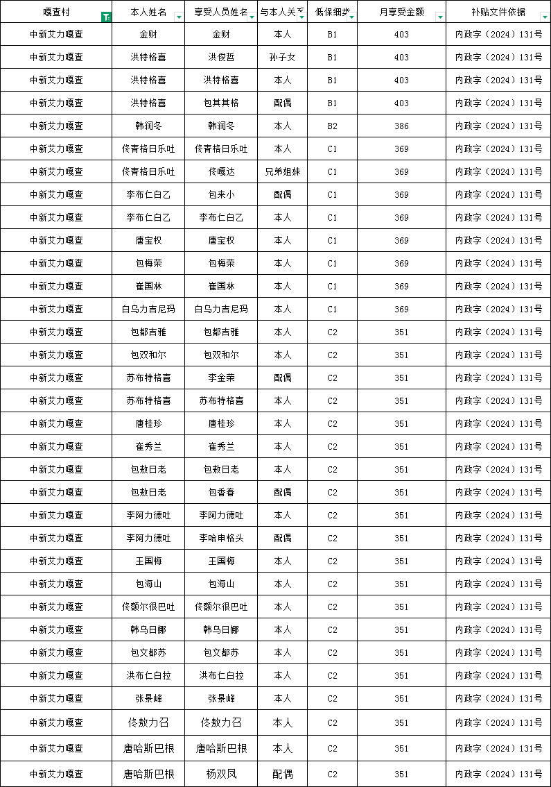中新艾力嘎查2026年2月农村低保资金发放花名册