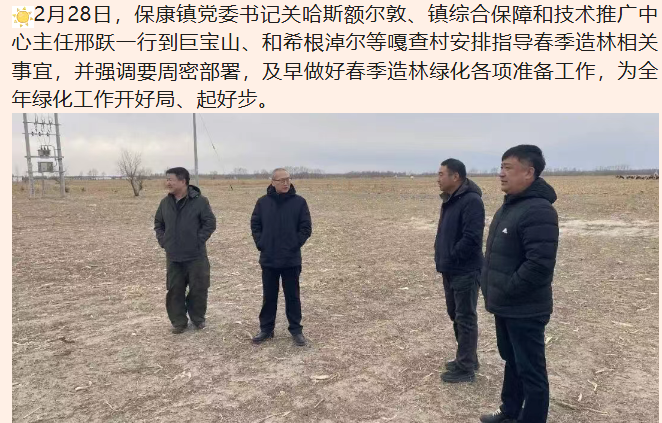 2月28日,保康镇党委书记关哈斯额尔敦、镇综合保障和技术推广中心主任邢跃一行到巨宝山、和希根淖尔等嘎查村安排指导春季造林相关事宜