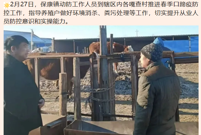 2月27日,保康镇动防工作人员到辖区内各嘎查村推进春季口蹄疫防控工作,指导养殖户做好环境消杀、粪污处理等工作,切实提升从业人员防控意识和实操能力。