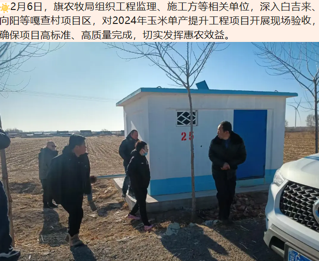 2月6日,旗农牧局组织工程监理、施工方等相关单位,深入白吉来、向阳等嘎查村项目区,对2024年玉米单产提升工程项目开展现场验收,确保项目高标准、高质量完成,切实发挥惠农效益。