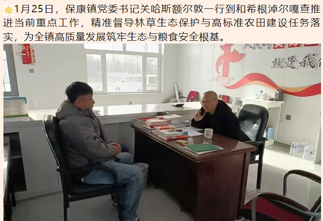 1月25日,保康镇党委书记关哈斯额尔敦一行到和希根淖尔嘎查推进当前重点工作,精准督导林草生态保护与高标准农田建设任务落实,为全镇高质量发展筑牢生态与粮食安全根基。