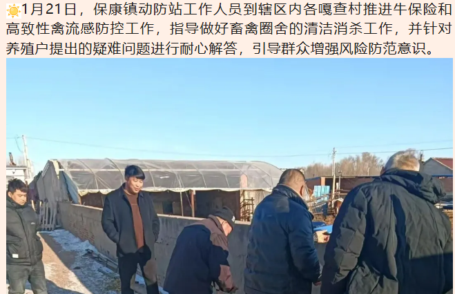 1月21日,保康镇动防站工作人员到辖区内各嘎查村推进牛保险和高致性禽流感防控工作,指导做好畜禽圈舍的清洁消杀工作,并针对养殖户提出的疑难问题进行耐心解答,引导群众增强风险防范意识。