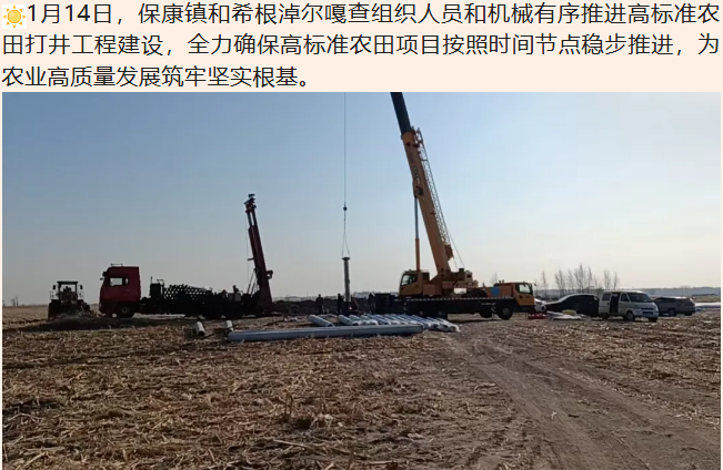 1月14日,保康镇和希根淖尔嘎查组织人员和机械有序推进高标准农田打井工程建设