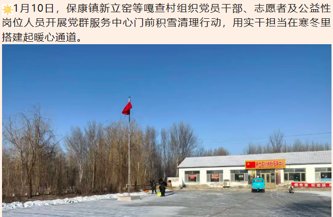 1月10日,保康镇新立窑等嘎查村组织党员干部、志愿者及公益性岗位人员开展党群服务中心门前积雪清理行动,用实干担当在寒冬里搭建起暖心通道。