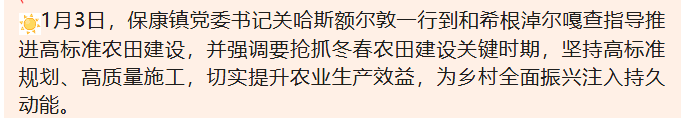 1月3日,保康镇党委书记关哈斯额尔敦一行到和希根淖尔嘎查指导推进高标准农田建设