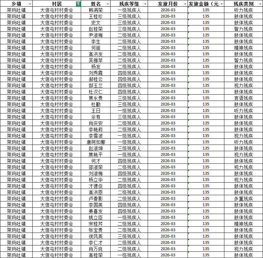 大信屯村2026年3月残疾人生活补贴发放花名册